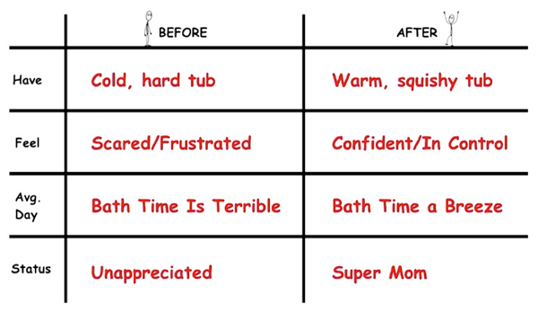 Do you see how this copy clearly articulates how the product will move mom from a “Before” state of stress and unhappiness to to an “After” state of joy and happiness with baby?